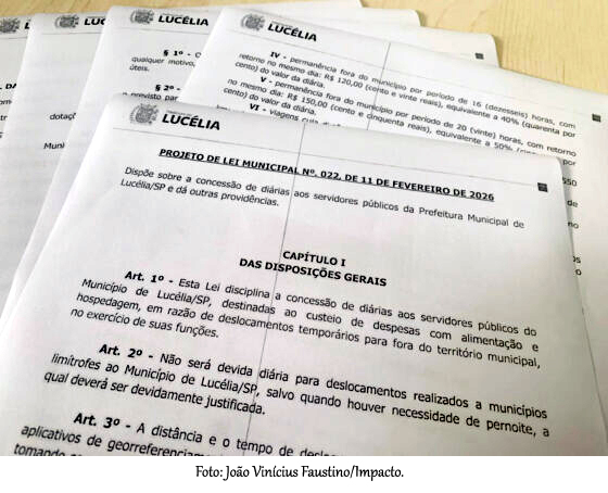Projeto substitui regime de adiantamento por diárias fixas e provoca debate sobre transparência e fiscalização dos gastos públicosLucélia (SP) - A Câmara Municipal de Lucélia aprovou, na sessão da última segunda-feira (23), o Projeto de Lei nº 022/2026, de autoria do Poder Executivo, que autoriza a concessão de diárias aos servidores públicos municipais, chefe de gabinete, diretores e secretários. Com a alteração no regime de pagamento de despesas de viagem, o valor destinado a cobrir alimentação e hospedagem em deslocamentos oficiais para Brasília (DF) poderá aumentar em até 78%.