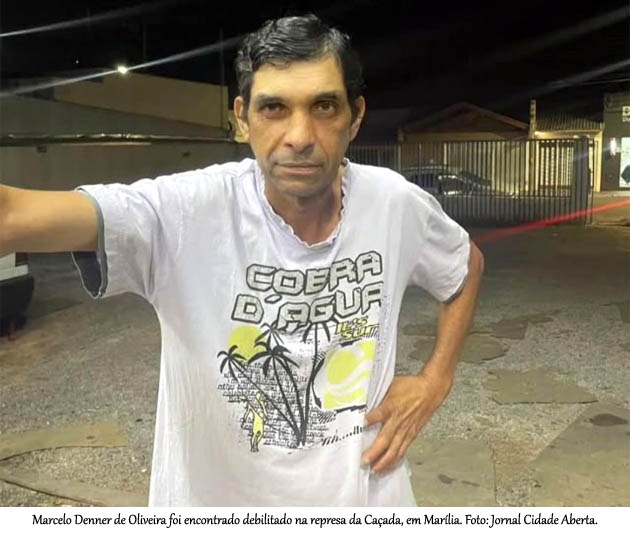 Marcelo Denner de Oliveira foi encontrado debilitado na represa da Caçada, em MaríliaMarília (SP) - O caso de desaparecimento de um morador de Osvaldo Cruz na cidade de Marília terminou com um desfecho positivo neste domingo (19). Marcelo Denner de Oliveira, de 52 anos, foi localizado com vida após passar mais de 24 horas desaparecido na cidade.